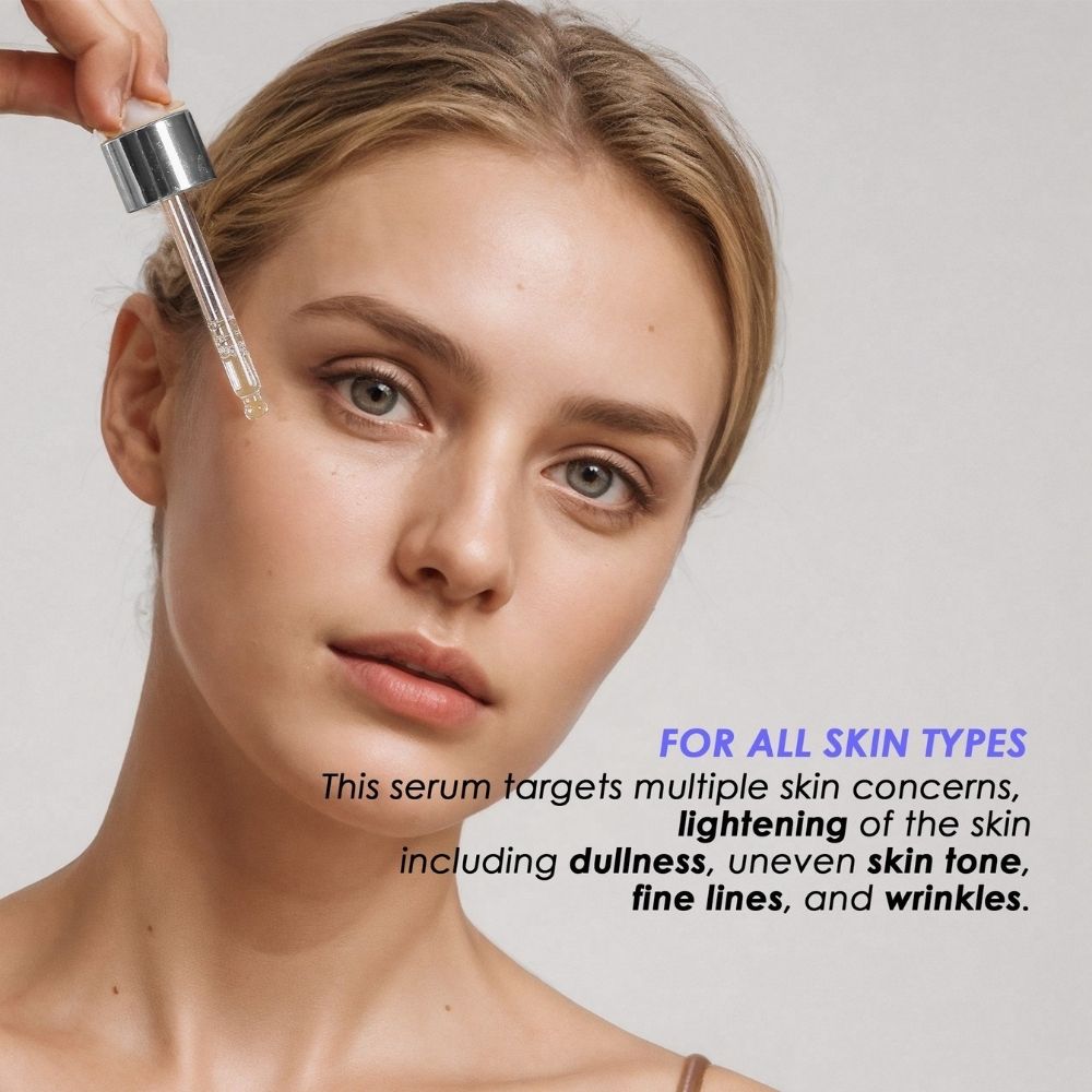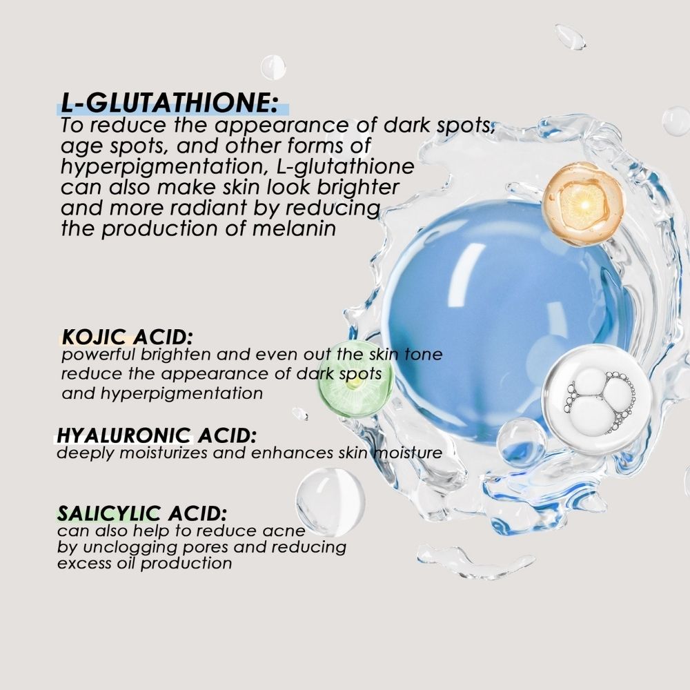 ✅ [إشراقة واضحة]: يستهدف هذا السيروم عدّة مشكلات جلدية مثل البهتان، تفاوت لون البشرة، الخطوط الدقيقة، والتجاعيد. يقوم الجلوتاثيون بتفتيح البشرة، بينما يساهم حمض الكوجيك في توحيد اللون وتقليل العيوب. يرطّب حمض الهيالورونيك البشرة ويزيد من امتلائها، بينما يقشر حمض الساليسيليك البشرة وينظف المسام بعمق.