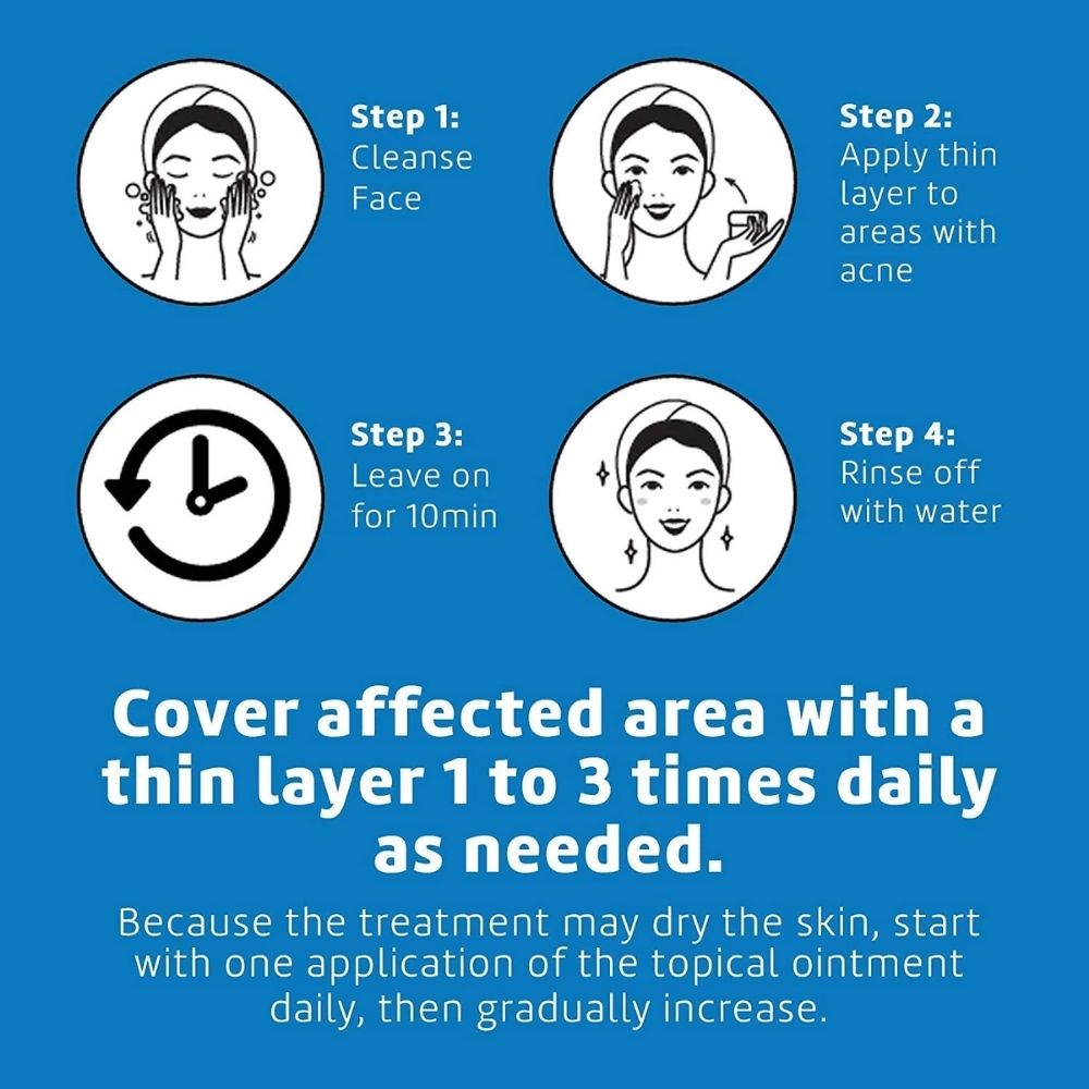 نظف البشرة جيدًا قبل الاستخدام. ضع طبقة رقيقة تغطي كامل المنطقة المصابة مرة إلى ثلاث مرات يوميًا. اتركه لمدة 10 دقائق ثم اغسله جيدًا بالماء. بسبب احتمال جفاف البشرة المفرط، يُنصح بالبدء بتطبيق واحد يوميًا ثم زيادة العدد تدريجيًا إلى مرتين أو ثلاث مرات حسب الحاجة أو بتوجيه الطبيب. إذا حدث جفاف أو تقشر مزعج، قلل الاستخدام إلى مرة واحدة يوميًا أو كل يومين.